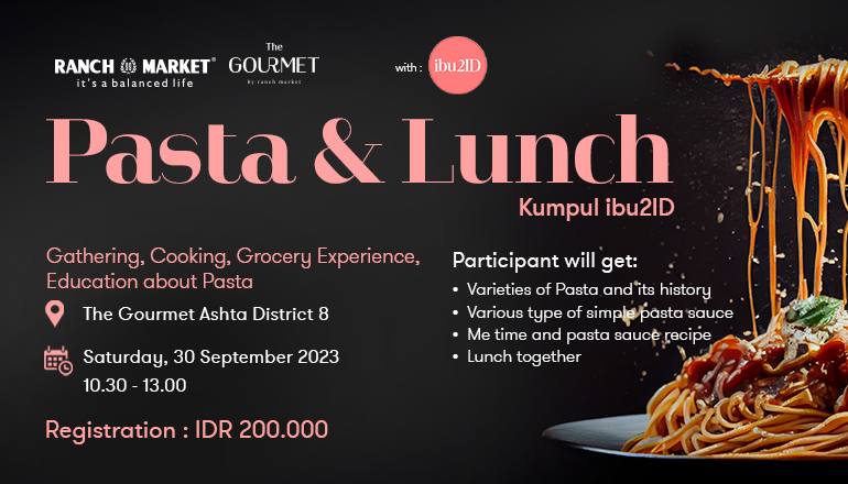 Join Pasta & Lunch mom gathering with @ibu2id Kumpul ibu2ID will be held at The Gourmet Supermarket Astha District 8 on Saturday, 30 September 2023.