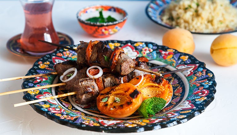 Thread the meat onto skewers along with the soaked dried apricots and chunks of onion, putting one or other between each chunk of meat.