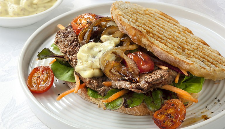 - Spread the bottom piece generously with garlic aioli. Top with rocket, then tomato slices, beef, caramelized onion. Spread the top piece of bread with mustard then place on top.